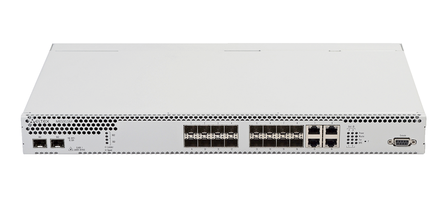 MES3116F — управляемый L3-коммутатор с 12 оптическими портами и 4 комбинированными портами. Предназначен для построения масштабируемых оптических сетей.