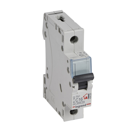 Однополюсный автоматический выключатель серии TX3 типа C (для защиты линий группового освещения и нагрузок с большими пусковыми токами (бытовая техника) в жилых и производственных помещениях). Номинальный ток - 16А. Отключающая способность - 6кА. Размер - 1 модуль DIN (17,5 мм).