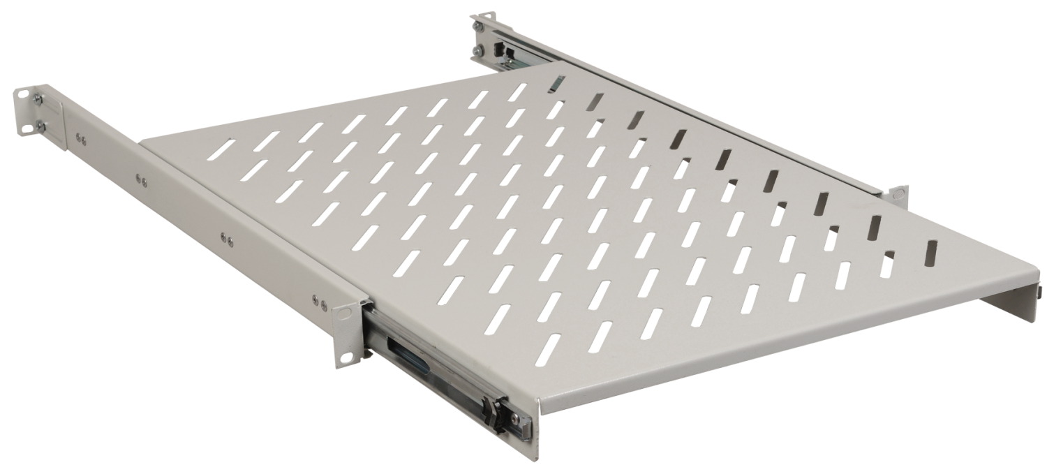 Выдвижные полки крепятся на фронтальные и на задние профили, имеют перфорированную поверхность для обеспечения лучшего охлаждения и отведения теплых воздушных потоков, а за счёт наличия специальных телескопических салазок способны плавно выдвигаться вперед за пределы рабочей плоскости, образованной передней парой 19'' профилей. Данные полки рассчитаны на оборудование, требующее регулярного обслуживания и извлечения из шкафа, но с небольшой общей массой, чтобы избежать его опрокидывание и возможной поломки выдвижного механизма полки.